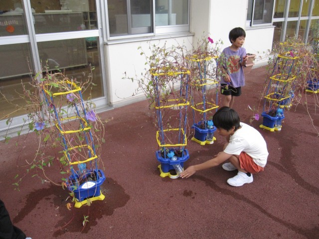 1年生が朝顔の種取りをしていました。まだぽつぽつと花が咲いています。
