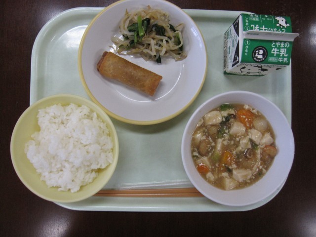 きょうの給食は、ごはん、牛乳、春巻き、小松菜ひたし、えびと豆腐のうま煮です。