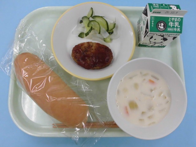 今日の給食は、コッペパン、牛乳、ハンバーグのケチャップかけ、大根サラダ、クリームスープです。