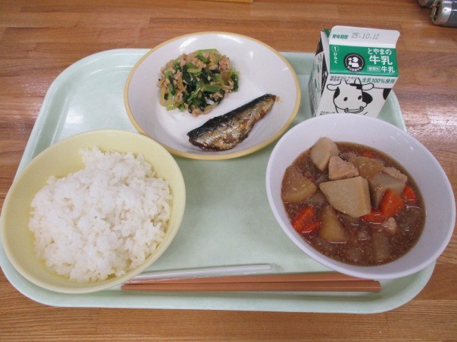 今日の給食は、菜めし、牛乳、いわしの梅煮、納豆和え、鶏肉と里芋のごま煮です。