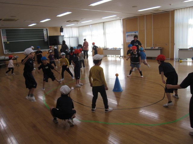 水橋幼稚園の園児のみなさんと一緒に体育をしていました。的あてをしながら、みんな楽しんでいました。