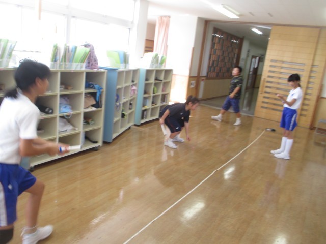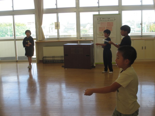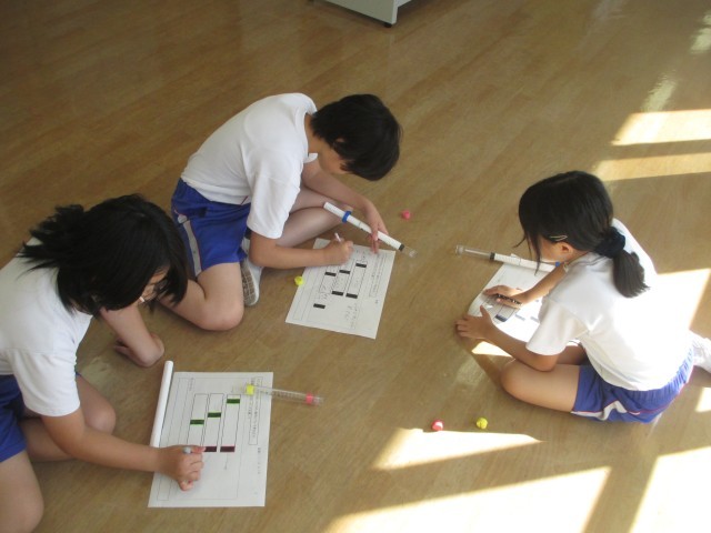 今日は空気鉄砲を使って、「閉じこめた空気を押すと、どのような様子になるのだろう?」ということについて考えました。後ろの球を押すと、しばらくしてから前の球が押し出される様子から、中の空気の様子を想像して、一人一人ワークシートに表していました。次回の話し合いが楽しみです。