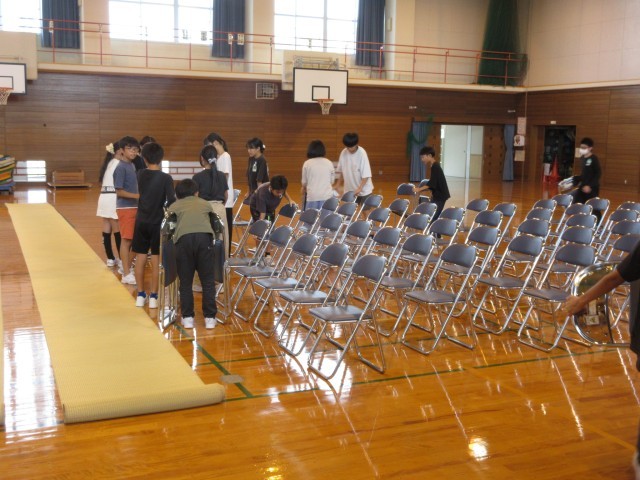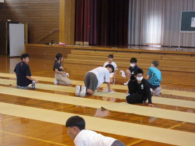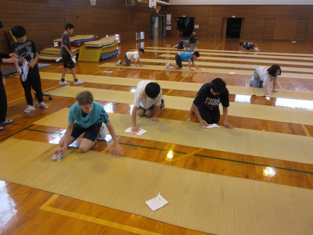 さて、先日、6年生が学習発表会で保護者の方や地域のみなさんに座っていただくための「ござ」を水拭きするなど、会場準備をしてくれました。今年度は、会場の前半分は「ござ」、後ろ半分は「パイプ椅子」の座席になっています。前の方のござは発表学年優先席としています。発表学年以外の保護者の方は、後方のござかパイプ椅子にお座りください。発表が終わるごとにアナウンスしますので、ご移動をよろしくお願いします。