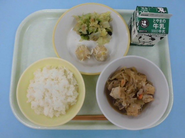 今日の給食は、ごはん、牛乳、コーンシューマイ、香味和え、厚揚げのうま煮です。