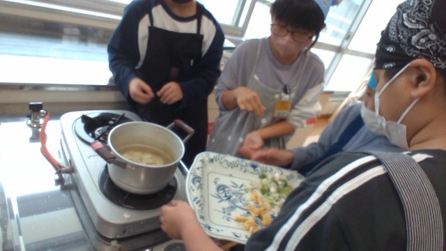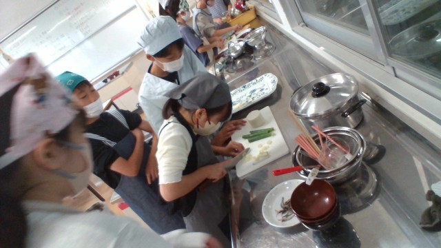 具材を食べやすい大きさに切ったり、火の入りやすい順番に具材を入れたりすることに注意しながらどの班もつくることができていました。