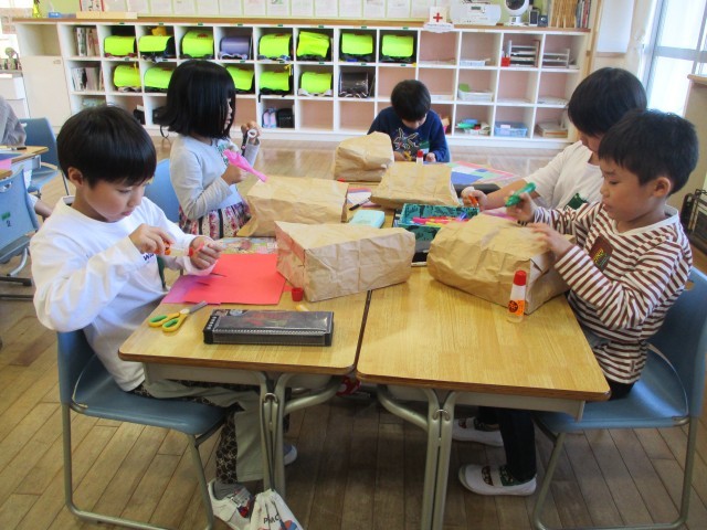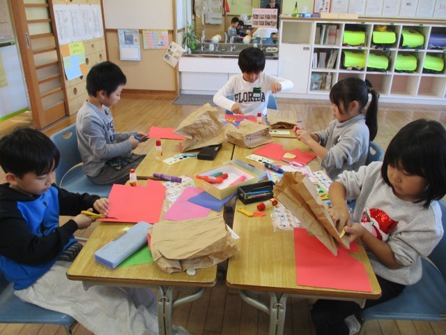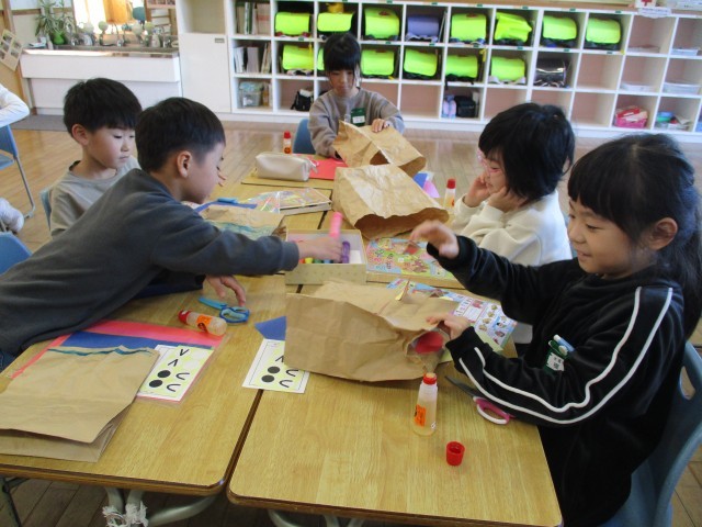 くしゃくしゃにした紙袋に手を入れてぱくぱくさせる動きから、いっしょにあそびたい友達を考えて作る学習です。「うさぎ」「ねこ」「さめ」「ロボット」など、作りたいものが決まった子供たちは、材料を工夫して使い、楽しみながら自分の友達を作っていました。