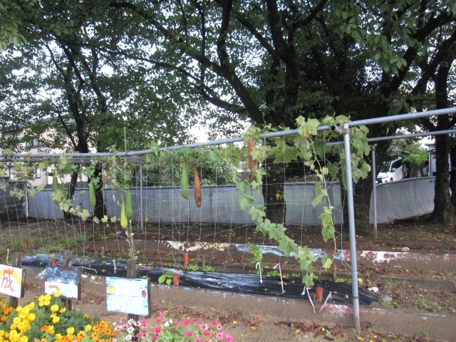 きのうは一日中雨模様で、きょうの記念写真撮影が心配されましたが、なんとか大丈夫のようで、グラウンドには朝早くから白線が引いてありました。週明けですが、子供たちは元気に登校しています。花壇のヘチマがずいぶんと茶色くなってきました。