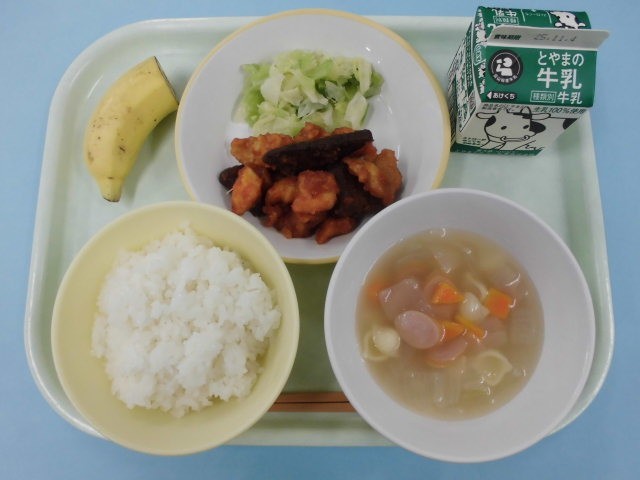今日の給食は、ごはん、牛乳、鶏肉とレバーのケチャップからめ、ゆでキャベツ、マカロニスープ、バナナです。