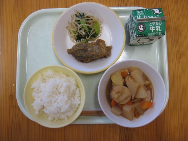 きょうの給食は、ごはん、牛乳、あじのえごま揚げ、チンゲン菜ひたし、おでんです。
