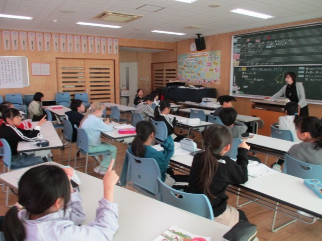 音楽科で「アルルの女」第1組曲からを鑑賞し、旋律の重なりなどを確認していました。目を閉じたり、指揮をしたりしながら曲の特徴を感じ取っていました。