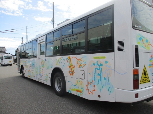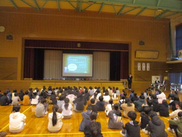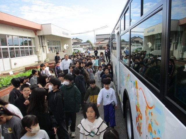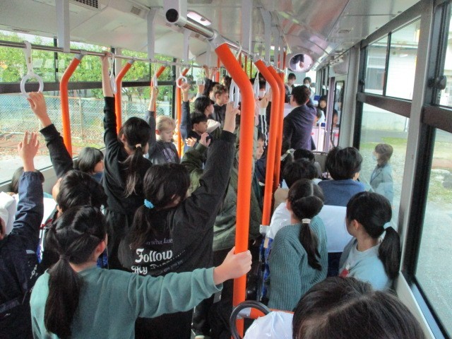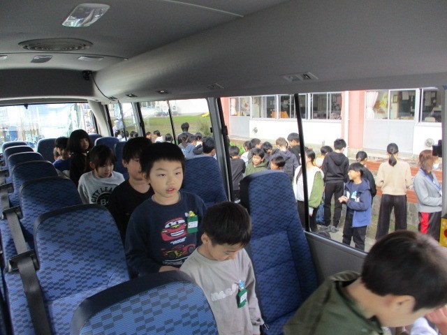 水橋学園のスクールバスの乗り方や交通安全について学びました。体育館で、動画やクイズを通して基本的なルールやマナーを学んだ後、実際のスクールバスを使って乗車体験を行いました。大型バスとマイクロバスの2種類を全校児童が体験し、ラッピングの済んだバスも見ることができました。バス通学への期待がいっそう高まったようです。安全に気を付けて登下校したいと思います。