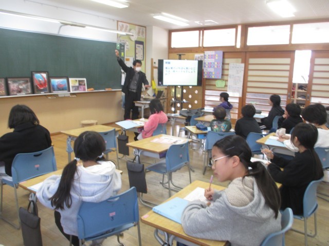 今日は、水橋フィッシャリーナの方にゲストティーチャーとして来ていただき、水橋の海について詳しくお話を伺うことができました。富山の海にはたくさんの魚がいることや、多くの資源があることを教えていただき、子供たちは改めて水橋の海を大切にしたいという気持ちをもったようです。