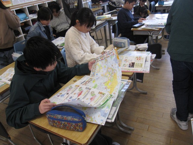 社会の時間です。世界地図を広げて、いろいろな国の場所を確認していました。