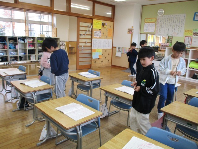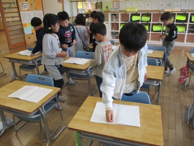 1学期から自学ノートをこつこつと続けてきた1年生。今日は、13日から始まる大成っ子パワーアップ週間を前に、友達同士で自学ノートを見合いました。「丁寧に字の練習をしているからいいな」「算数の問題を作るのを自分でもやってみたいな」など、友達の取り組みのよさを感じていました。