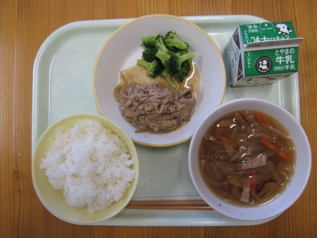 きょうの給食は、ごはん、牛乳、豚肉のおろし炒め、ゆでブロッコリー、ワンタンスープです。