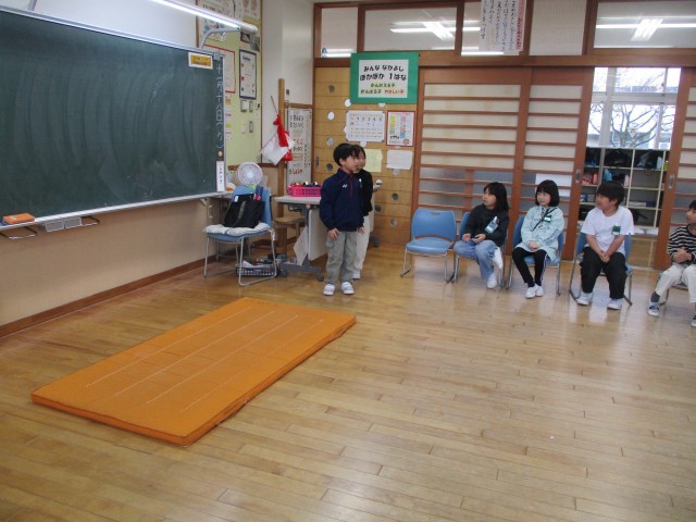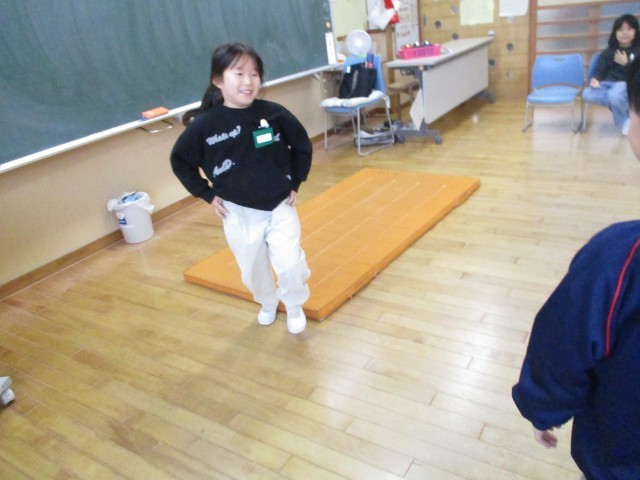 マット運動の側転とブリッジ、絵、ダンスの発表がありました。