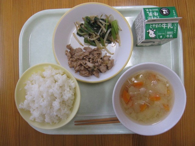 きょうの給食は、焼き肉どん、牛乳、ナムル、具だくさん汁です。
