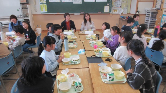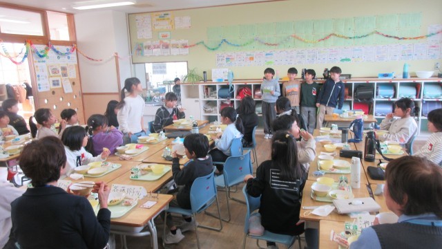 教室での会食では、4名の方と一緒に給食を食べました。クイズタイム、自己紹介タイム、しりとりタイムなどを通して、地域でお世話になっている方と進んで関わることができました。