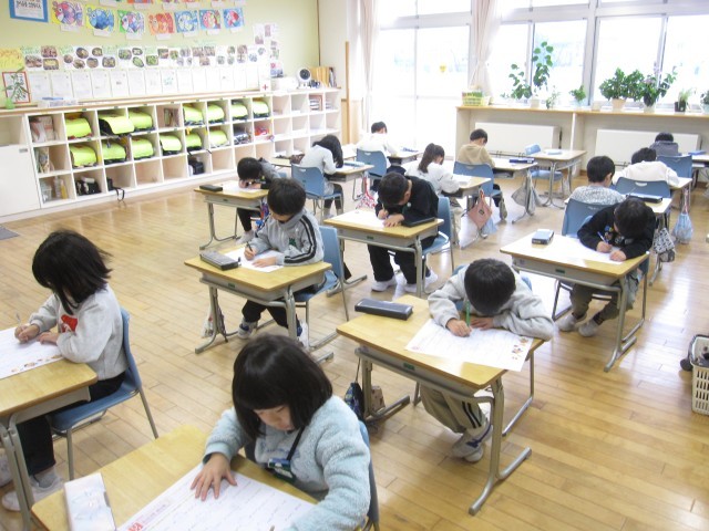 国語の時間です。これまでに習った漢字のテストをしていました。とめ、はね、はらい等、一画一画丁寧に書いていました。