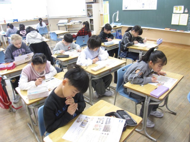 社会のテスト中です。写真などの資料を見ながら問題に答えていました。