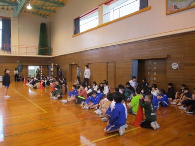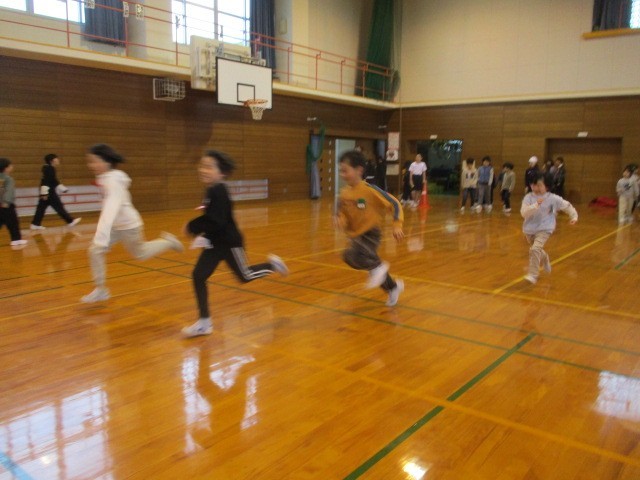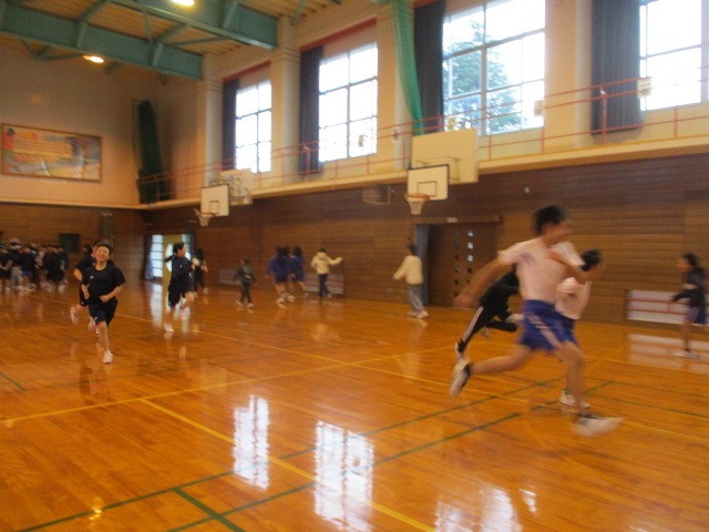 トレーニングタイムで体育館を元気よく走りました。写真ではとらえきれないほどの勢いです。元気いっぱいのパワーで運動、勉強に取り組んでいきます。