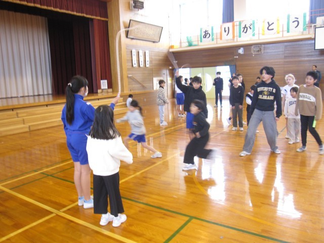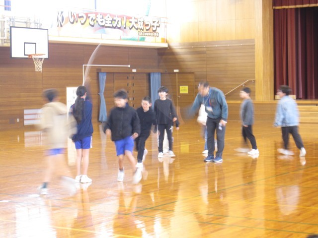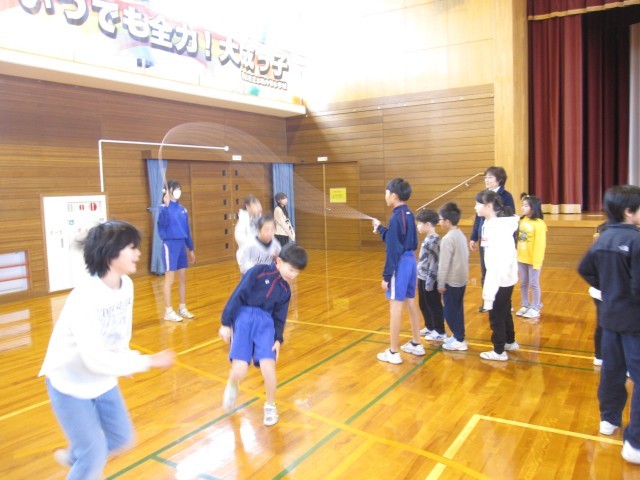 きょうからトレーニングタイムは長縄に取り組みます。はじめに健康委員会の子供たちが手本を見せてくれました。その後、二つのファミリーが一緒になってグループをつくり練習が始まりました。これからの上達が楽しみです。