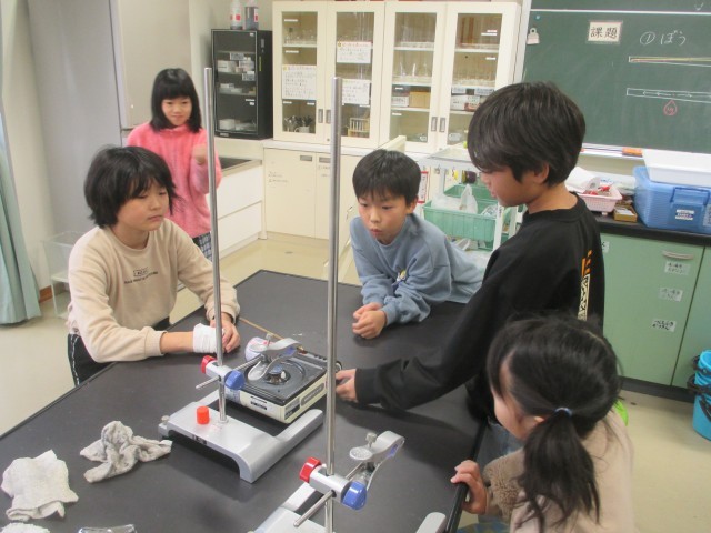 先日から「物の温まり方」の学習をしています。金属を棒と板を温めると、どのように温かさが伝わっていくかを一人一人が予想してから、実験しました。金属は熱したところから順に温まる様子がサーモテープの色の変化でよくわかり、子供たちも思わず「わぁ!」と声をあげていました。