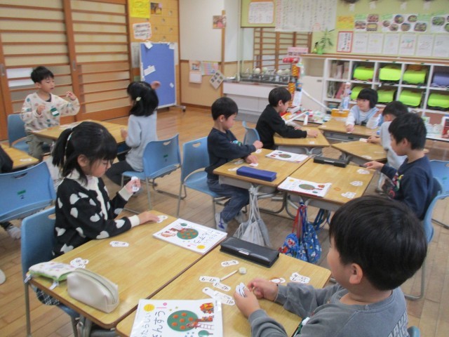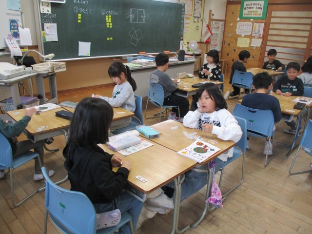 今日の算数は、ひきざんカードを使って繰り下がりのあるひきざんの練習をたくさんしました。一人で練習、友達と問題を出し合って練習、答えの大きさ比べで練習といろいろな方法で練習しました。これからも家と学校で練習を繰り返し、数の組み合わせを見たらすぐに答えられるくらいのスピードを目指していきます。