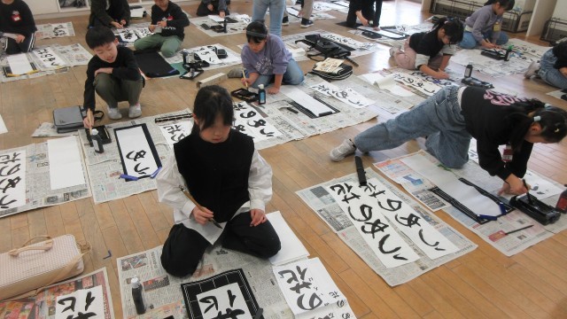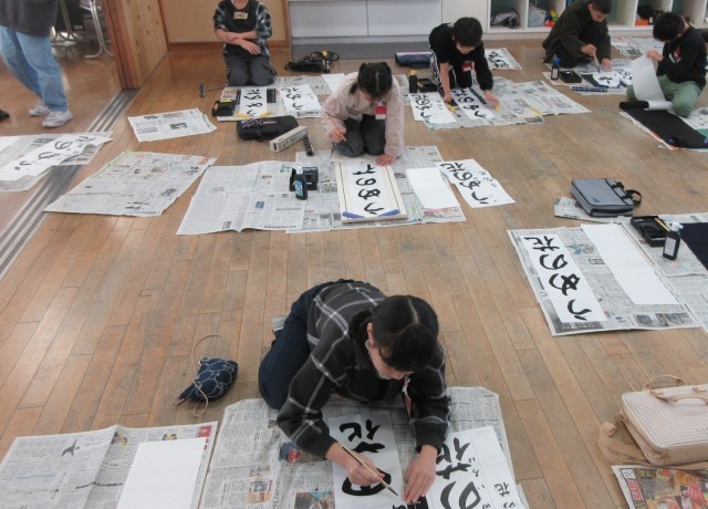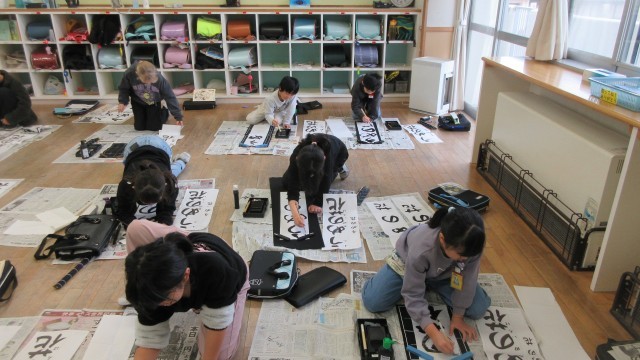 書初の練習で「うめの花」と書きました。四文字が紙におさまるように気を付けて筆を動かしていました。
