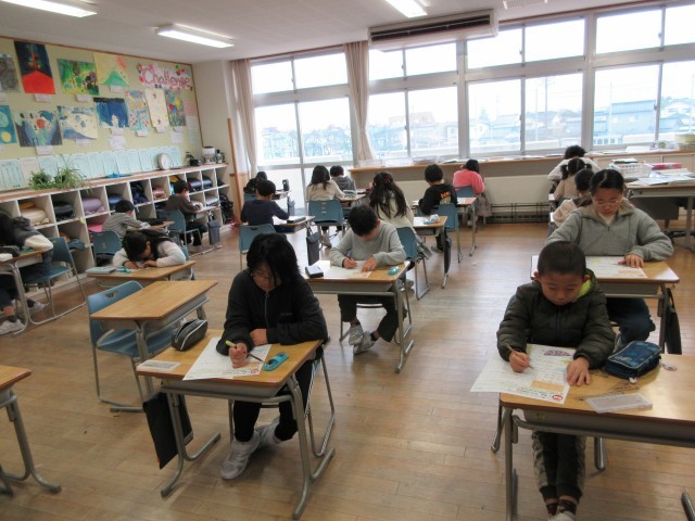 算数の最後の単元のテストをしていました。2学期にはわり算、小数や分数、図形や変わり方調べなどたくさん学習しました。冬休みにしっかり復習しましょう。