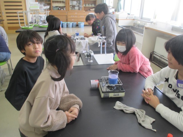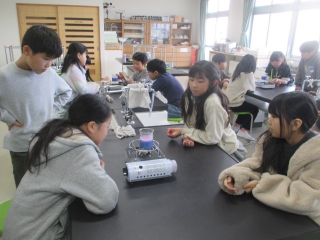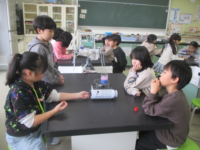 先日から物をあたためる学習をしてきていましたが、今日は子供たちが一番楽しみにしていた水をあたためる実験を行いました。最初は青色の示温インクを熱すると、熱せられて温められピンク色に変わった水が上に上がり、その後上から順に温められた水が移動していくことを目で見て理解することができました。