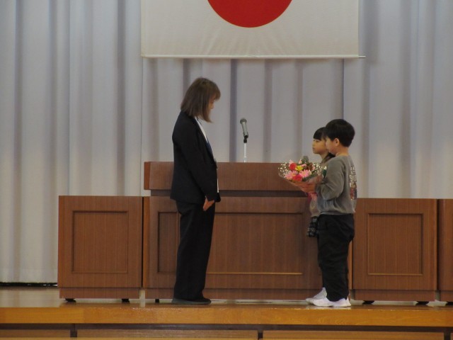 また、1年生の代表の子が、はきはきと2学期にがんばったことを発表しました。おせわになった先生に花束をわたす役も1年生の代表2人がおこない、感謝の気持ちをしっかりと伝えることができました。教室に戻って、がんばった3人に拍手がおくられました。