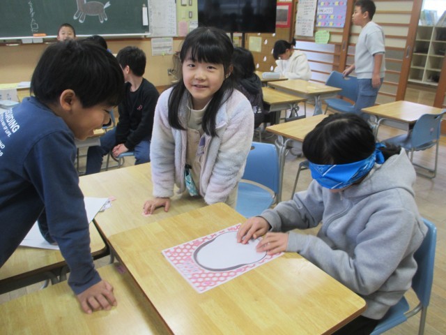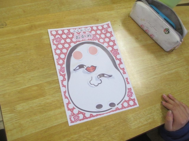 学級活動の時間には、正月の遊びの一つである「福笑い」をしました。面白い顔が出来上がり、みんなで「初笑い」をして楽しい時間を過ごすことができましたね。明日から閉校までの約3ヶ月、充実した時間を過ごしていけるよう、がんばりましょう!