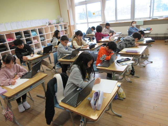 図工の時間です。「わたしのパパ・ママの絵をかきましょう」のコンクールに向けて絵をかいていました。クロムブックで撮った写真をよく見ながら顔をかいています。