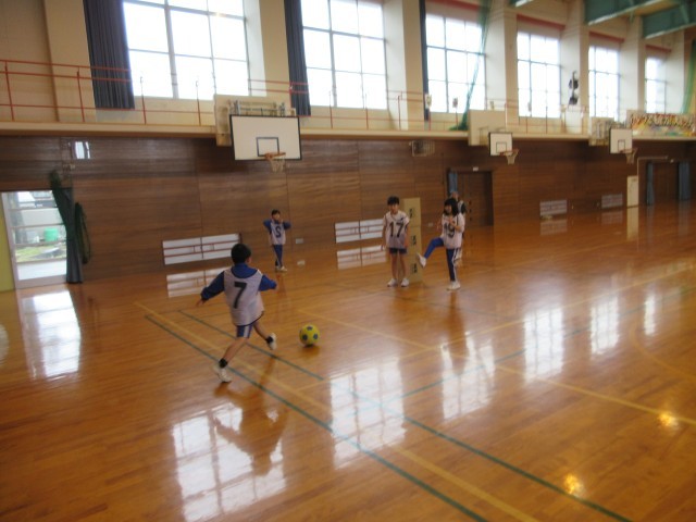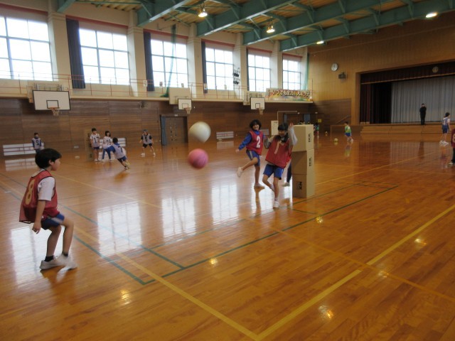 体育の時間です。グループに分かれて、段ボールが積み上げられた的に向かってボールを蹴っていました。