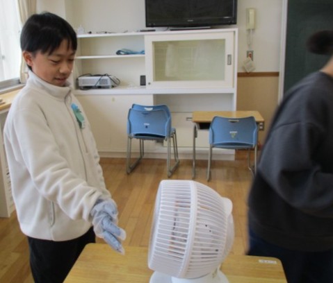 家庭科では、冬を明るく暖かく快適に過ごすための生活の工夫を考える学習が始まりました。今日は、冬の気候の特徴を確認したあと、重ね着の効果を確かめる実験をしました。綿の手袋を下着やTシャツ、毛糸の手袋をセーター、ビニール手袋をコートに見立て、手にはめて風をあて、感じ方の違いを確かめることができました。