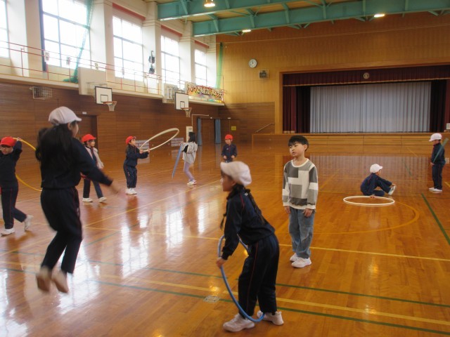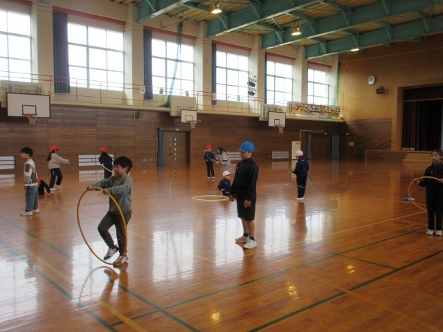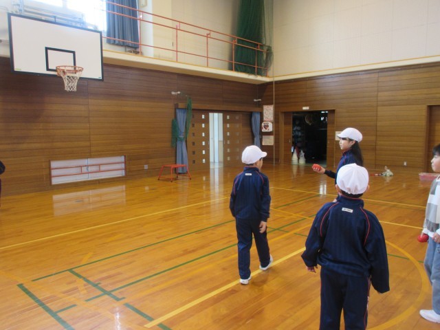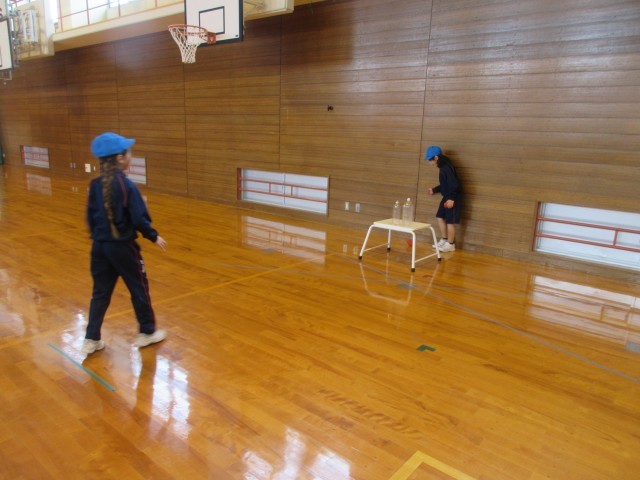 技セブンの各種目に挑戦しました。「フラフープで前とび、後ろとび20回とぶ」「バスケットのフリースローラインからゴールのボードに玉をあてる」「3mはなれたペットボトルに玉をあてる」をやってみました。子供たちは「後ろとびはフープを回すのがむずかしいな」「1回でペットボトルにあたったよ」といいながら、一生懸命にチャレンジしていました。のびのびタイムにも練習していきます。
