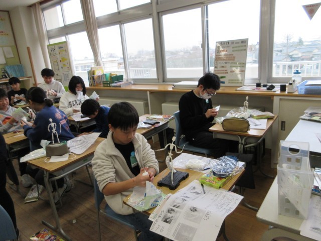 図工「未来のわたし」の学習です。きょうは芯材のポーズを決めて、紙粘土を付け始めていました。どんな自分を想像しているのでしょうか。
