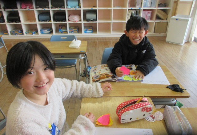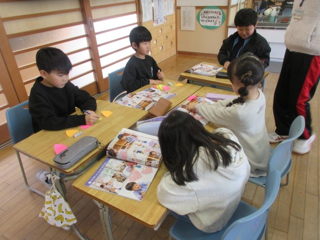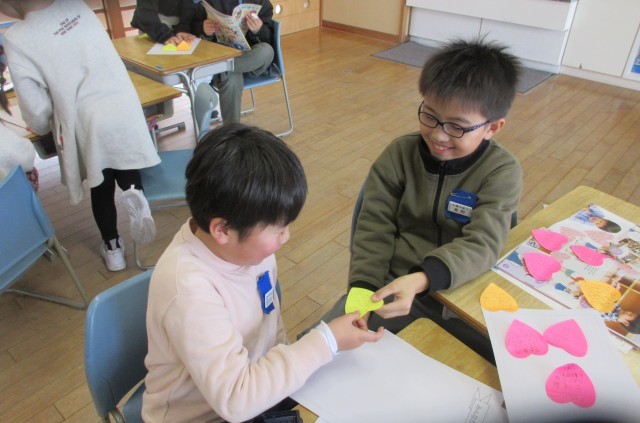 今日の生活科「わたしたんけん」は、友達のいいところをメッセージカードに書いて交換しました。