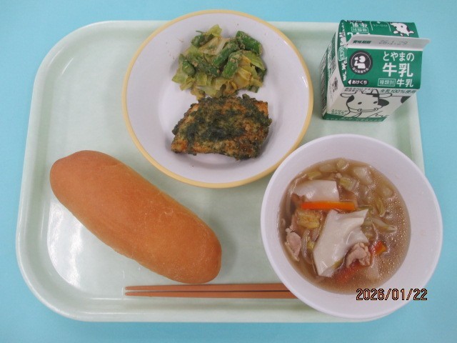 今日の給食は、コッペパン、牛乳、ホキの磯辺揚げ、アスパラのごまだれ、ワンタンスープです。調理員さんがコッペパンを温めて提供してくれました。香ばしくいつも以上においしくいただくことができました。
