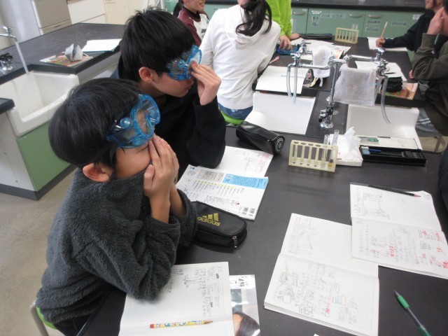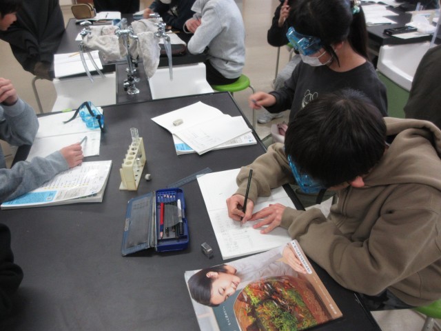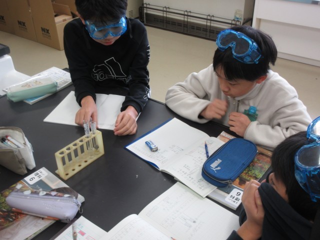 理科の授業で、塩酸の中に鉄やアルミニウムを入れるとどうなるのか実験しました。あわを出して溶けていく様子を観察し、ノートにまとめました。