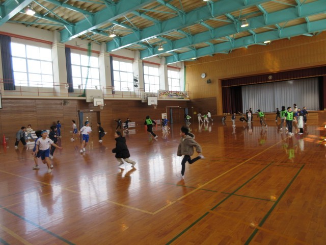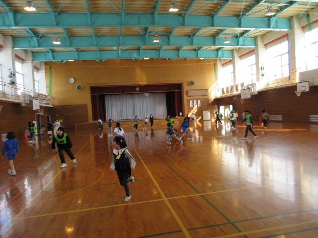 きょうからのトレーニングタイムは、おにごっこと縄跳びに分かれて行います。体育館では1、3、5年生がおにごっこをしました。鬼を交代しながら体育館中を元気に走り回っていました。