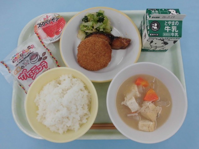 今日の給食は、ごはん、牛乳、ごま和え、具だくさん汁、★しいらのレモン味or★ハムカツ、●いちごゼリーor●ガトーショコラです。