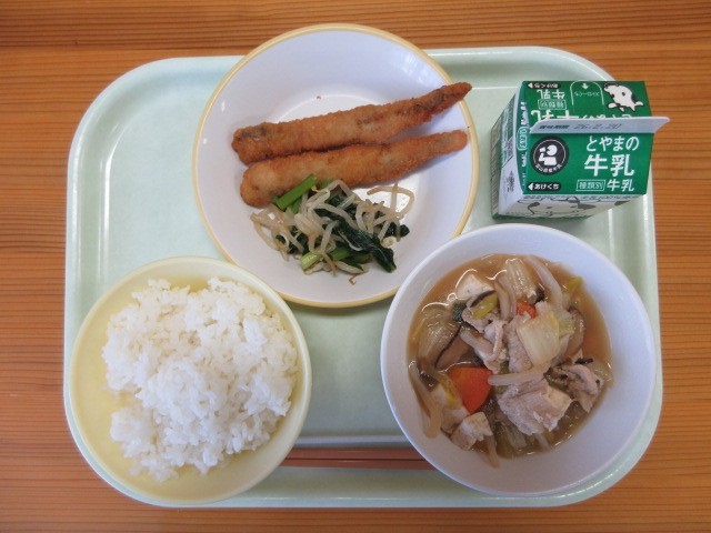 きょうの給食は、ごはん、牛乳、ししゃもフライ、しょうがひたし、肉豆腐です。