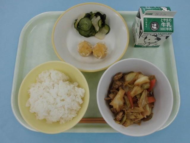 今日の給食は、ごはん、牛乳、にんじんシューマイ、甘酢和え、回鍋肉です。