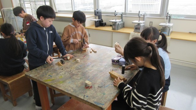 かなづちを使って木にくぎを打ったり、木をくぎで固定したりしました。