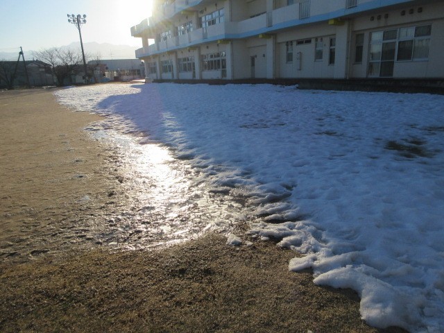今朝は天気はよいのですが冷え込んでいます。児童玄関前には雪がまだ残っており、溶けだした水で厚い氷が張っていました。きょうと明日は6年生が学級閉鎖のため5年生以下の子供たちで登校してきました。