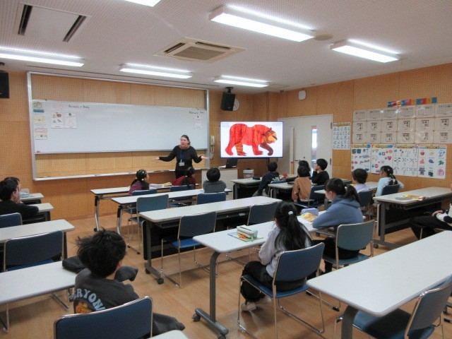 外国語活動の時間です。ALTが英語の絵本を読んでいました。「Brown bear」「Yellow bird」などこれまで学習した色や動物を表す英語が出ています。