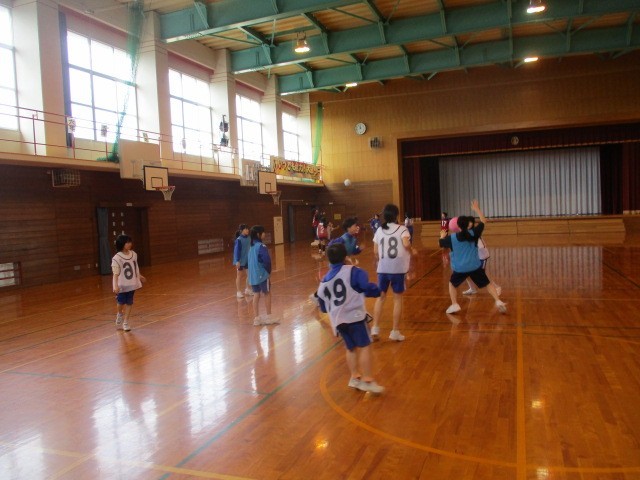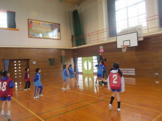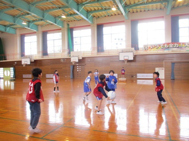 3学期、様々な用具を使い、多様な動きの運動に取り組んできました。今は大きなボールを使った「パスポートボールゲーム」を行っています。ドリブルができない分、みんなでパスを回してゴールを目指します。