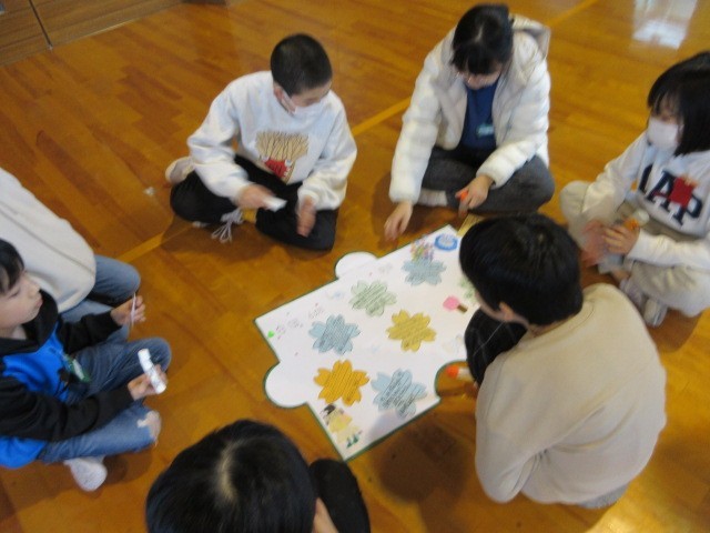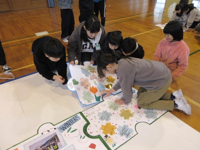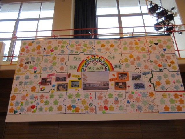 6年生が「つなげよう!笑顔のラストピース・プロジェクト」と題し、横断幕づくりを企画しました。閉校を前に、本校の思い出や水橋学園でがんばりたいことを一人一人がカードに書きました。ファミリーごとにカードやイラスト、折り紙を貼り、各ピースを仕上げました。そのピースを合わせて大きな横断幕ができました。子供たちや教職員の思いや学校への感謝の気持ちがいっぱいつまった横断幕になりました。